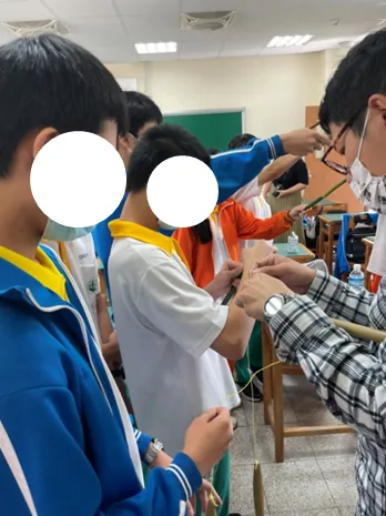 今日實作的「風笛」是台灣原住民鄒族的信號用具及祈雨法器,由一條繩子綁一支竹片構成。轉動風笛時,竹片會繞繩子自轉並拍打空氣而發出聲音,並有上下飛舞的現象。是得過科展的作品。