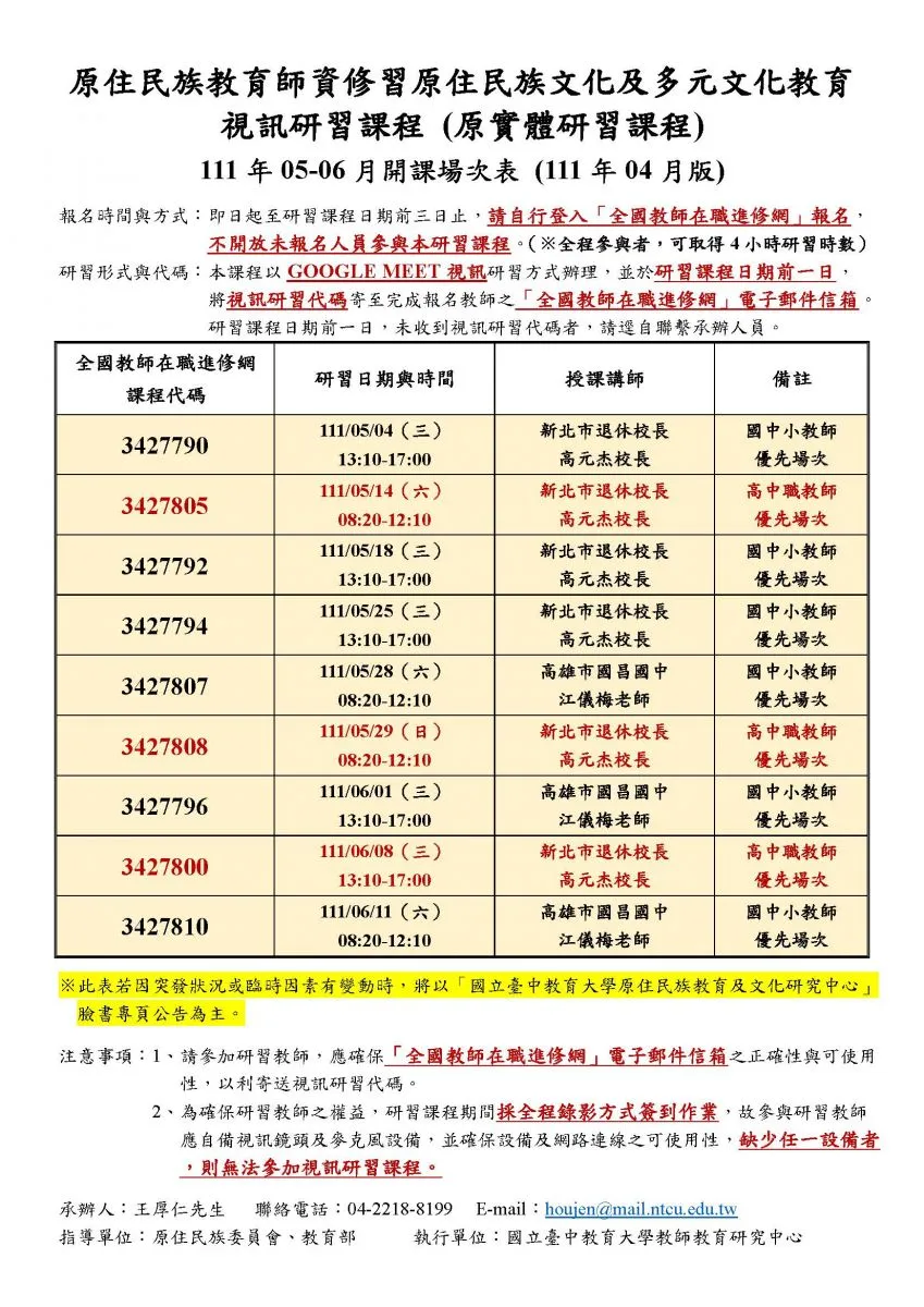 新增原住民重點學校教師修習原住民族文化及多元文化教育課程_111年05月份視訊研習課程場次