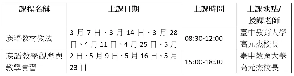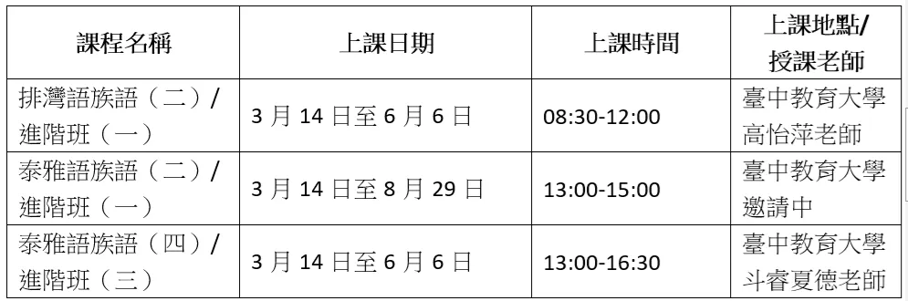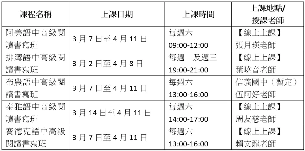※該課程皆需8人(含)以上才成班,如人數未達標將不開班;除布農語以外,其他以線上方式授課。